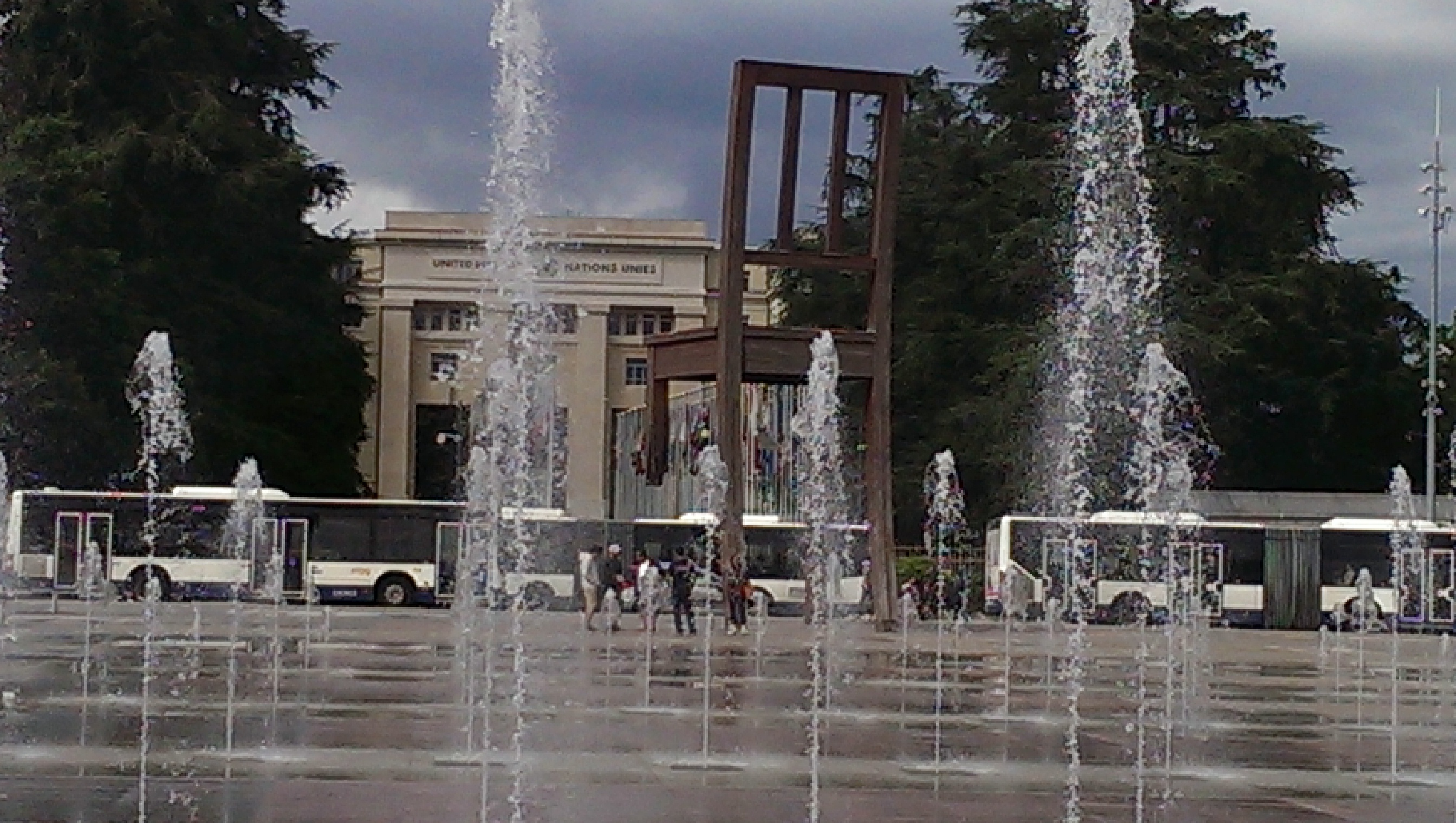 Now, for some highlights of the tour in the form of photos I took along the way. The first image that I’ve included is one I have included in previous posts, but one which I think warrants inclusion of any post on the Geneva headquarters of the U.N. This sculpture is called “The Broken Chair” and is located just outside the entrance gates of the U.N. The Broken Chair is a sculpture in wood by the Swiss artist Daniel Berset, constructed by the carpenter Louis Genève. It symbolises opposition to land mines and cluster bombs, and acts as a reminder to politicians and others visiting Geneva. It was erected in 1997 and was initially intended only to be in place temporarily, but was maintained as a permanent structure when a number of countries failed to ratify the “Ottawa Treaty”, established to eliminate anti-personnel land mines around the world.