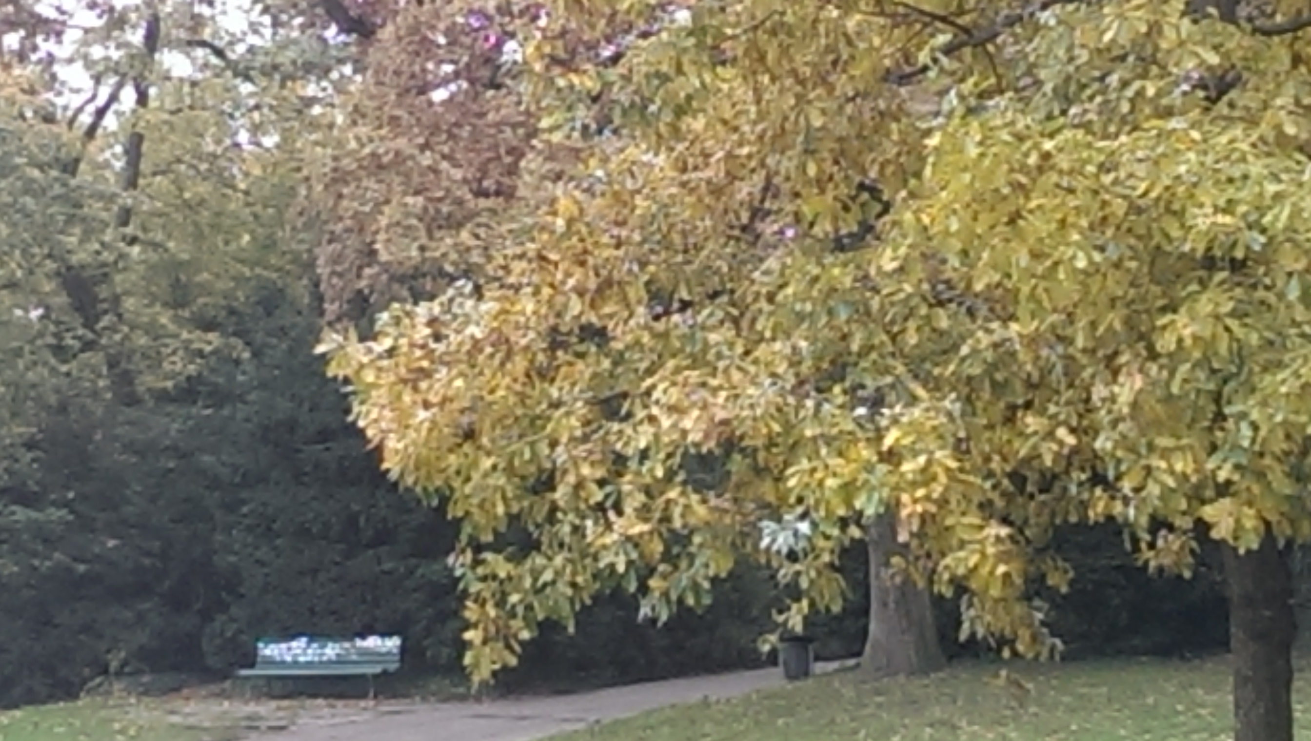 Note the contrast between the beautiful red and orange of the trees, with the dingy as hell green and yellow of the trash cans
