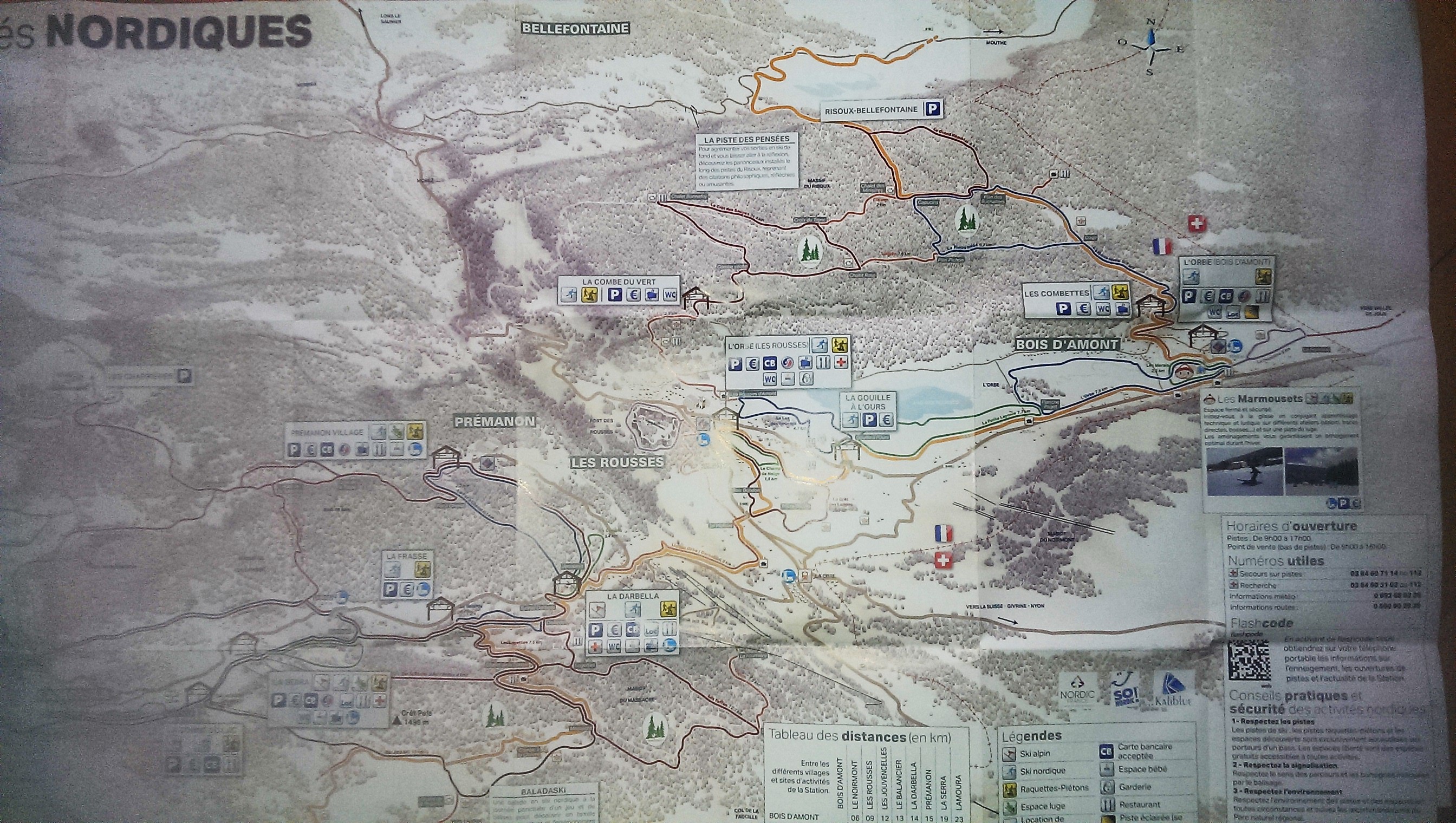 The Jura Mountains straddle the France-Swiss border and the arterial ski trail running from one end to the other – about 100 miles – is called the Grande Traversée du Jura.  A network of over 2,100 miles of beautifully maintained cross country ski trails weaves along its entire length from town to town.  We started our ski in a town called Les Rousses, which can be seen by clicking on the adjacent map, which will enlarge it.  This map shows only about 20% of the entire trail network.