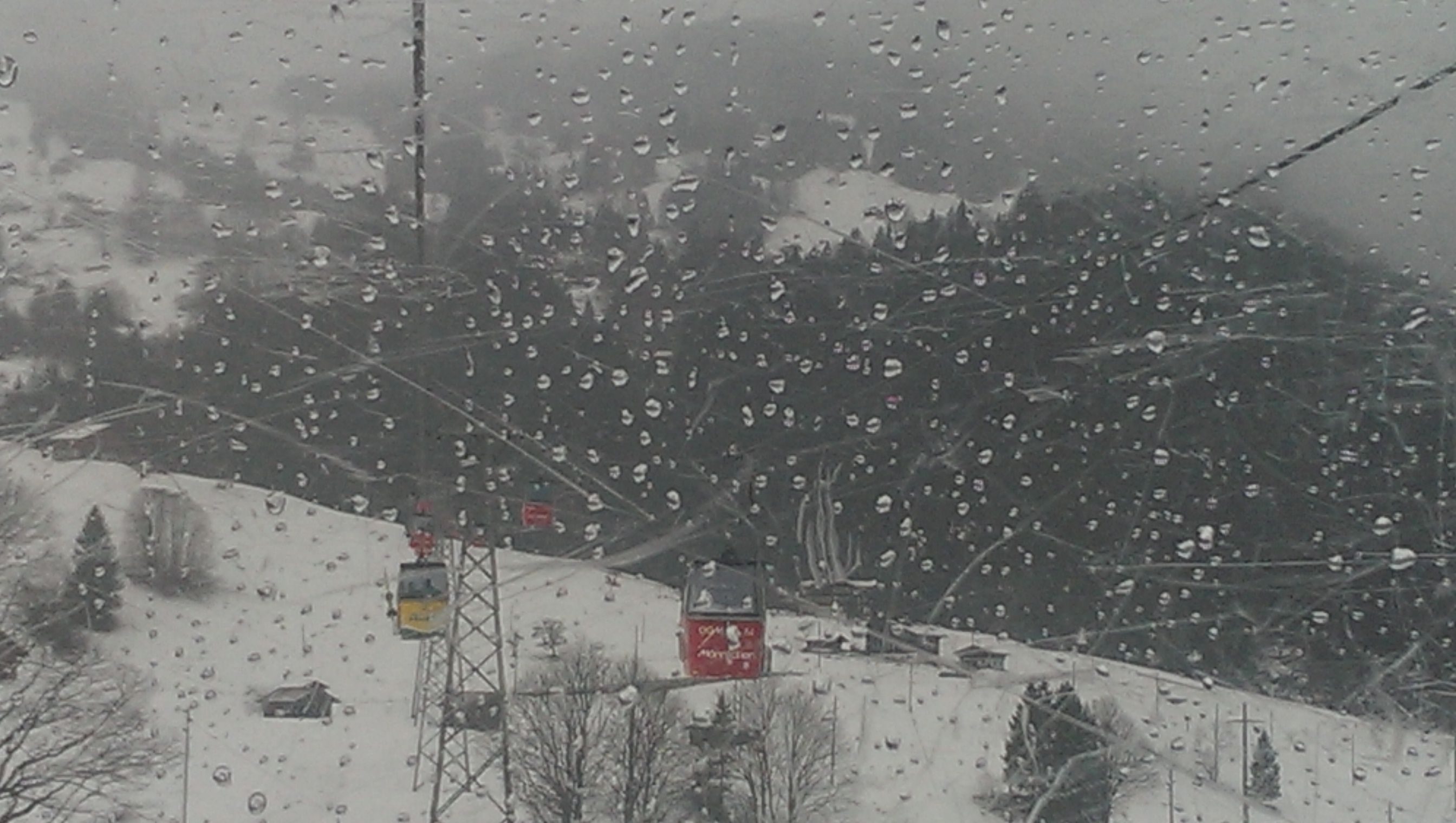 I bought my lift ticket, then climbed into the smallish yellow cab that ferries skiers up the mountain. As I gained altitude, the snow started to fall harder. You can see it coming down in this photo that I took from inside the lift.