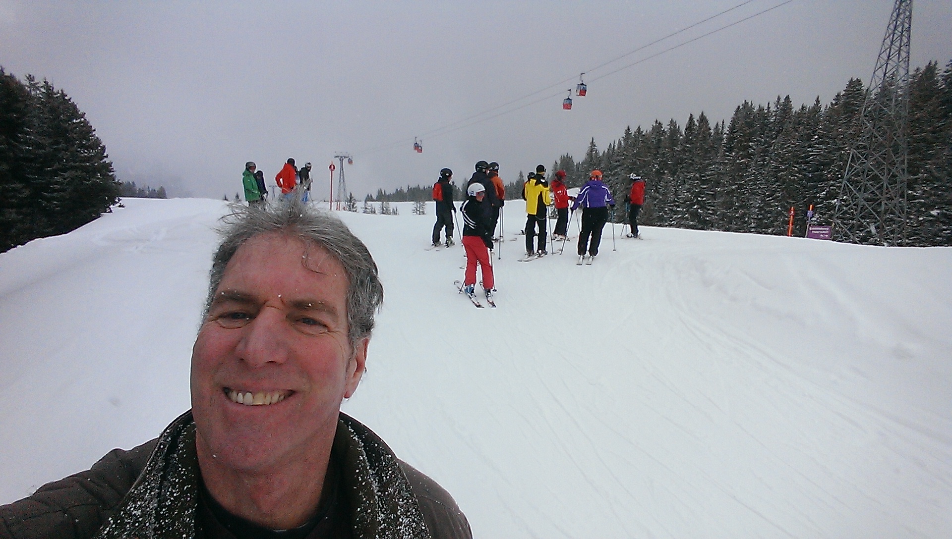Not much gets by me, and so I soon realized that I was the only person on the entire mountain not employing some sort of sliding apparatus to more easily (and rapidly) descend. Here’s a selfie I took with a few of my fellow winter adventurers, some of whom were curious enough to ask, “Did you forget your skis?”