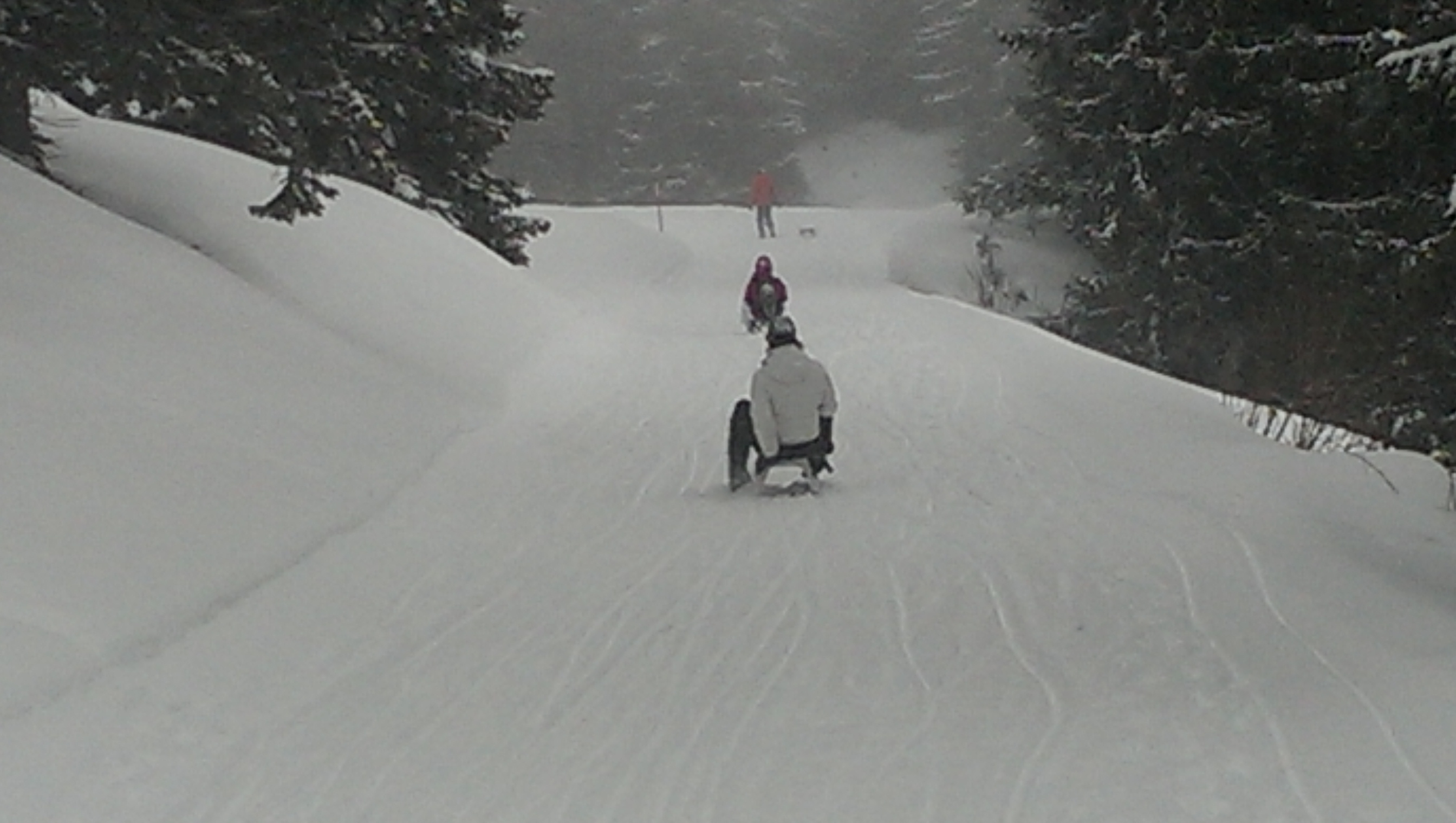 Slow sledders sliding down the slightly slippery slope.
