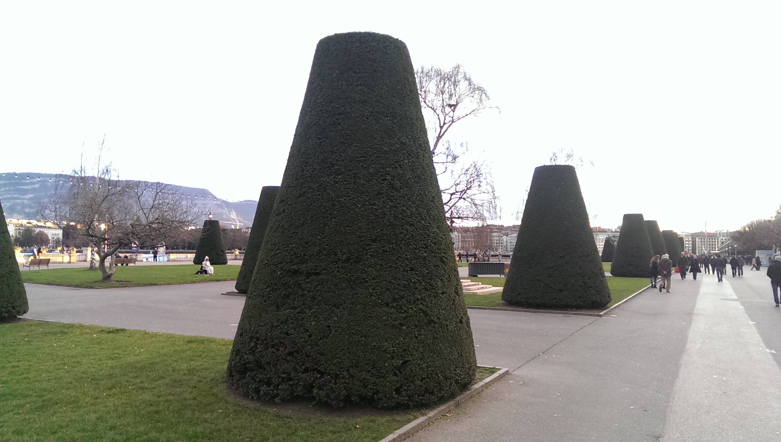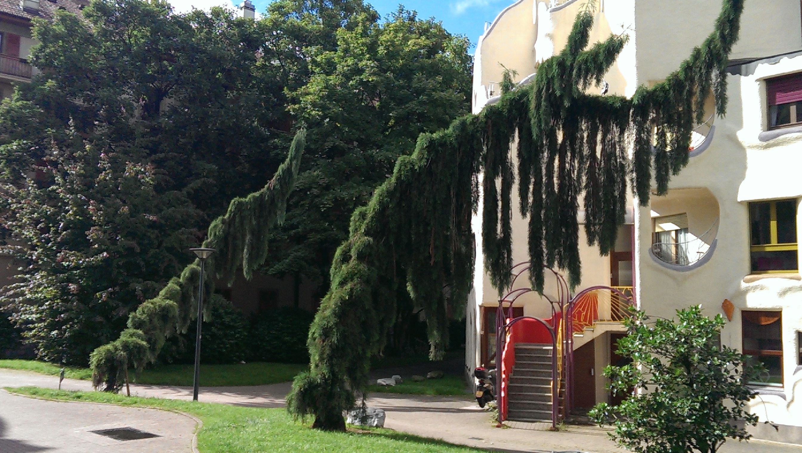 Here is a type of tree that is relatively common in Geneva. It’s called a Weeping White Pine. I took this picture a couple blocks away, in an apartment complex that looks like it’s straight out of Dr. Seuss. (Click on the photo to enlarge it, you’ll see what I mean.) I think the trees are a perfect fit for the building.