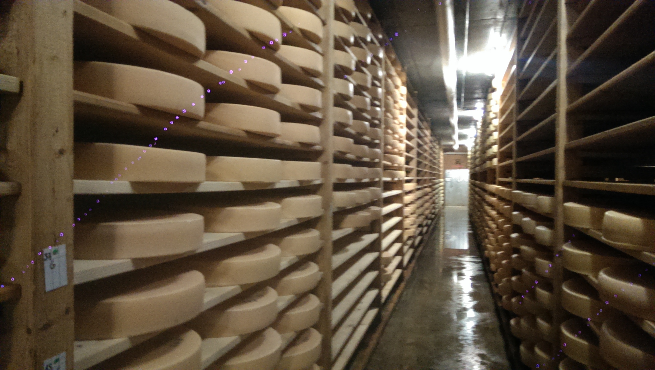 Cows make milk, and mild makes cheese, and the L’Étivaz region is perhaps the second most famous cheese making region (next to Gruyere, which is just down the road) in Switzerland. We had time for a tour, where I learned that it takes 10 liters of milk to make one liter of cheese – which explains why we saw so many cows marching through the village streets. I took this photo of one of the storage areas inside the cheese manufacturing facility.