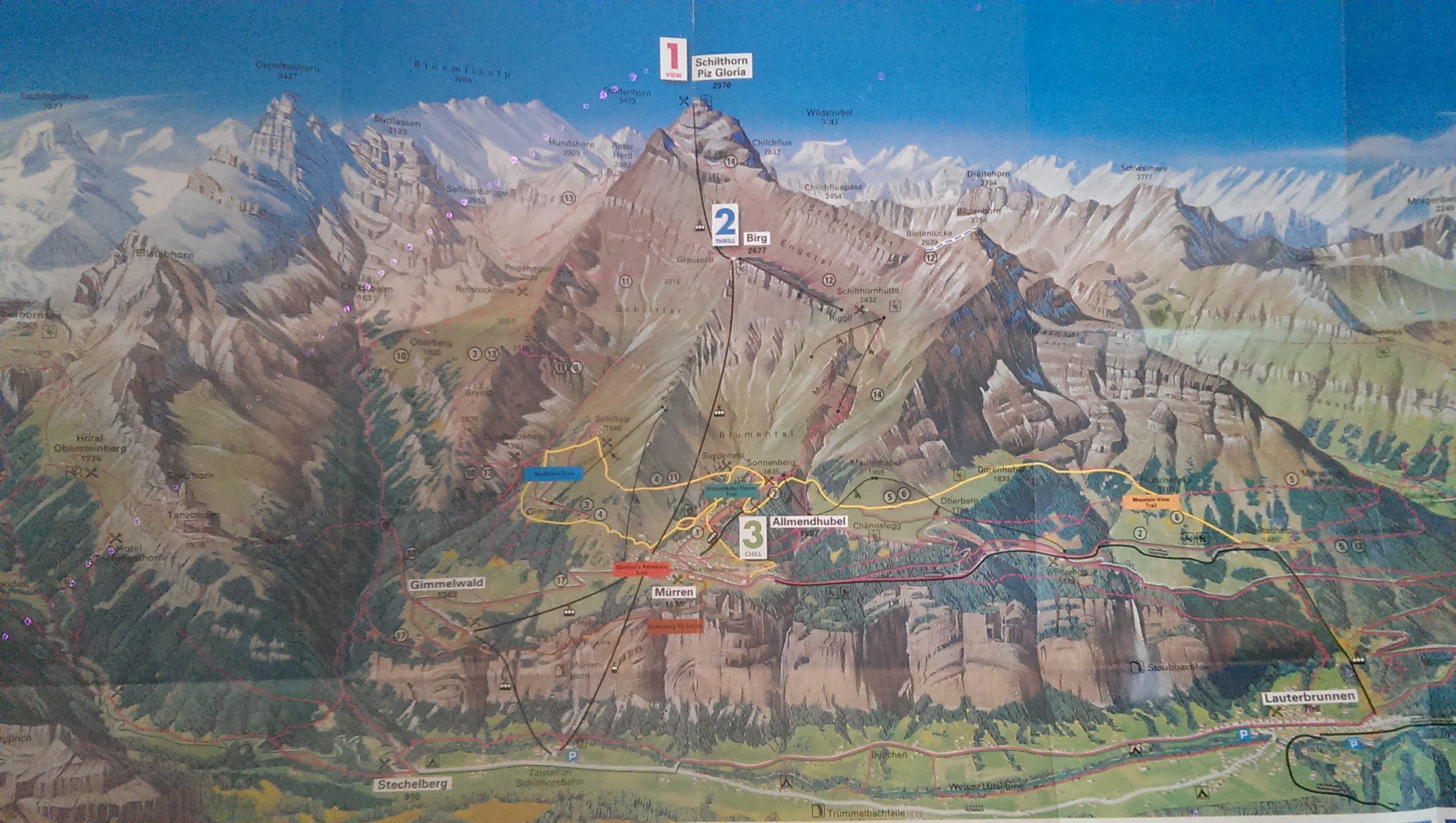 The image below is an artist’s rendering of the valley. I’m partial to the yellow trail, including the loop on the left side out of the town Mürren called the “Northface Trail” but depending on the disposition of whoever happens to be with me, the hike can be modified.