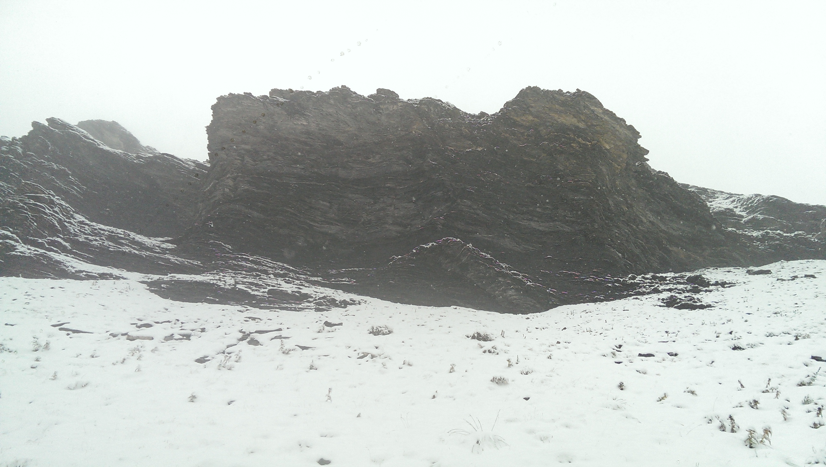 We did encounter some slushy snow on our way up to Birg, but the feature that really stands out at this altitude is the blackness of the stones, those underfoot as well as the big rocks that make up the mountain. I took a photo of this giant rock along the road.
