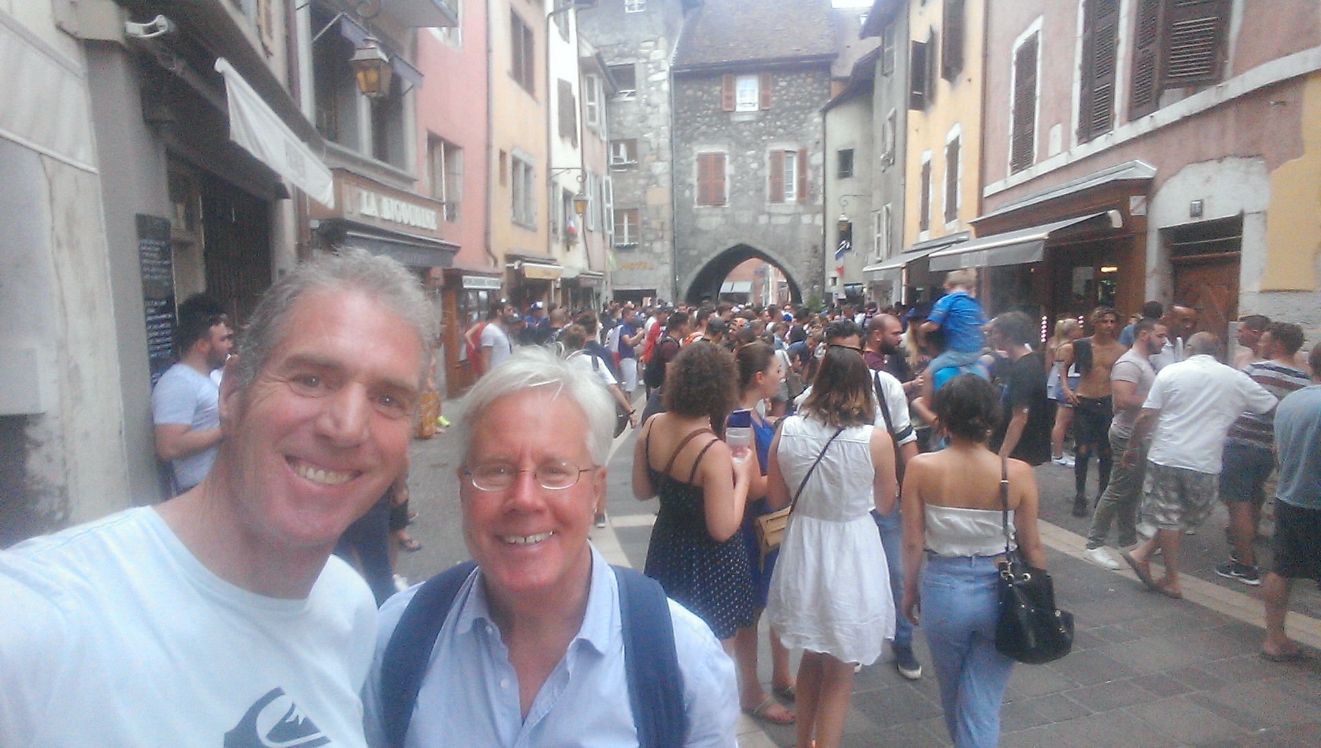 Last weekend was the final game, the championship featuring the favored French squad against the upstart and underdog Croatia. My friend Rodger called me and suggested we drive the 45 minutes over to Annecy, France to watch the game! I was all in! Here’s a picture of Rodger and me in Annecy at halftime.