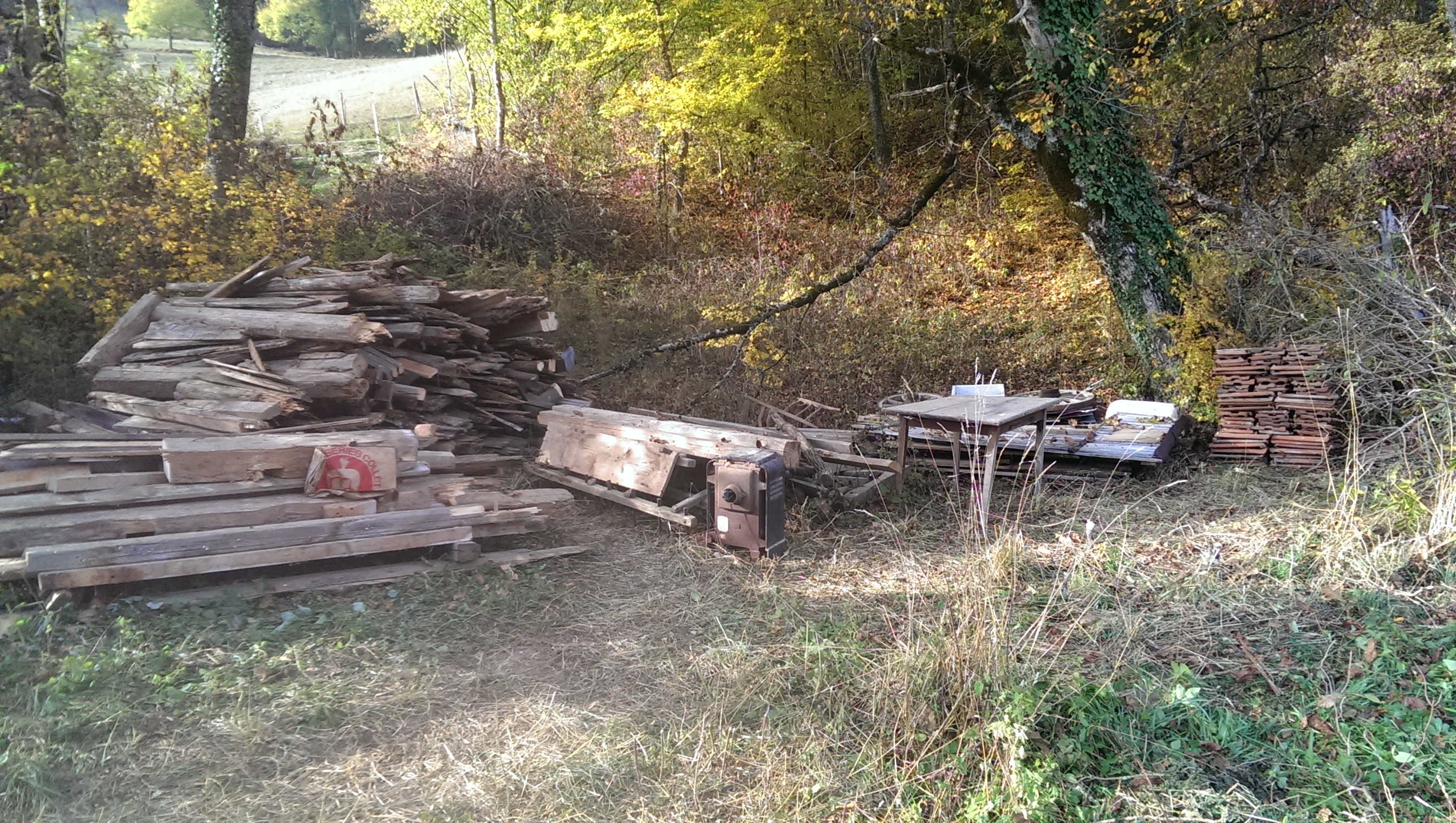 Throughout this whole process of course, we needed to find a place to deposit all the lumber, roofing panels, and other miscellaneous construction materials. Fortunately, there was a very convenient nearby spot to store it all. To be honest, I’m not sure what the long range plan is for all of this stuff, although Philippe did talk about someday using some of the salvageable lumber to build a storage area for firewood and other items. I did notice, though, that Philippe is not the only person who is storing piles of old lumber or other old building materials on their property, so it seems as though the practice is socially acceptable in this part of the world. And it’s not as though there is no place to put it. Lullin is a rural village and there’s plenty of open space around. Besides, we stacked it in very neat piles, as you can see from the photo below.